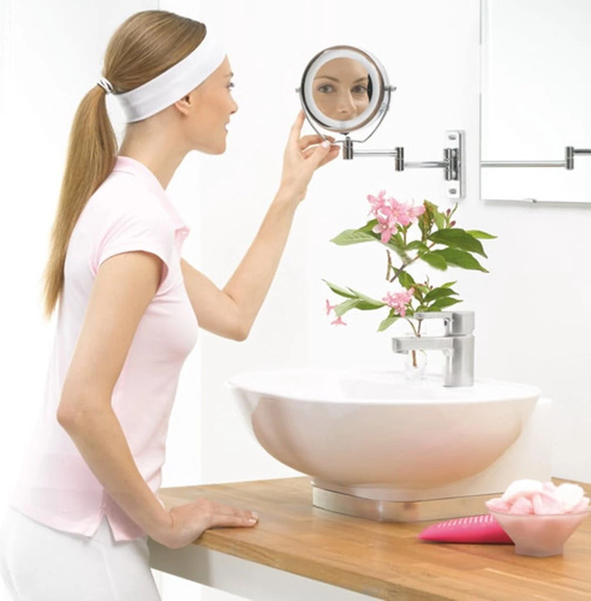 Deze dubbelzijdige Beurer cosmeticaspiegel, de BS59, is ideaal voor het epileren van uw wenkbrauwen, het aanbrengen van make-up, het inbrengen van je lenzen, enzovoort. De spiegel kan gebruikt worden als vrijstaande spiegel, maar het is mogelijk om hem aan de muur te monteren als wandspiegel. Het is eenvoudig om de spiegel van de muurbeugel af te halen, zo heb je altijd de keuze hoe en waar je de BS59 gebruikt. Deze spiegel is voorzien van 2 met LED verlichte spiegel oppervlakken, de ene zijde toont je gezicht in het originele formaat en de andere zijde zorgt voor een vergroting van 5 x. Met zijn soepele 360° kantel design is deze ronde spiegel zeer gemakkelijk in het gebruik.Het licht van de lamp wordt gevoed door 4 AAA batterijen, deze worden meegeleverd.Kenmerken van de Beurer BS59- 2-in-1 cosmeticaspiegel- Zwenkende spiegels- Normaal en 5x vergroting- Heldere LED-lamp- Hoogwaardige chroomafwerking- Afmetingen: 24,5 x 28 cm- Gewicht: 790 g- Diameter van spiegel 11 cm- Eenvoudige montage op de muur- Inclusief 4 AAA-batterijen