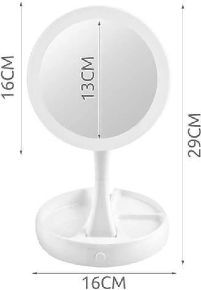 andere spiegel de werkelijkheid toont, zonder vergroting dus. Je kan de spiegel geheel inklappen, zodat je hem makkelijk mee kunt nemen op reis, mede door het lichtgewicht materiaal. Je kunt hem instellen tot een hoogte van circa 29 cm. Er zitten handige vakjes in om accessoires in op te bergen. De LED lampen werken op 4 x AA batterijen (niet meegeleverd), wel zit er een USB kabeltje bij dus kunt u hem ook via de computer of telefoonoplader met verlichting gebruiken.