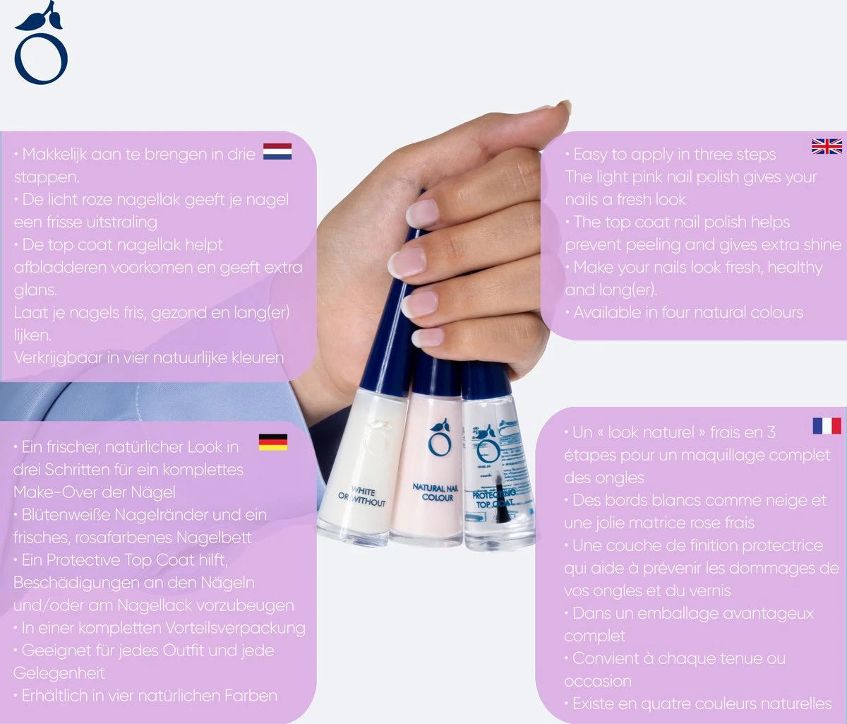 Een makkelijke manier om de schoonheid van je nagels te accentueren door de natuurlijke basis te versterken. De Nail Contour White or Without beschermt en verhardt het natuurlijke wit van je nagel. De licht roze nagellak geeft je nagel een frisse uitstraling. Door de nagelverharder in de top coat nagellak voorkom je afbladderen en geef je de nagel extra glans. Zo lijken ze gezond en lang.