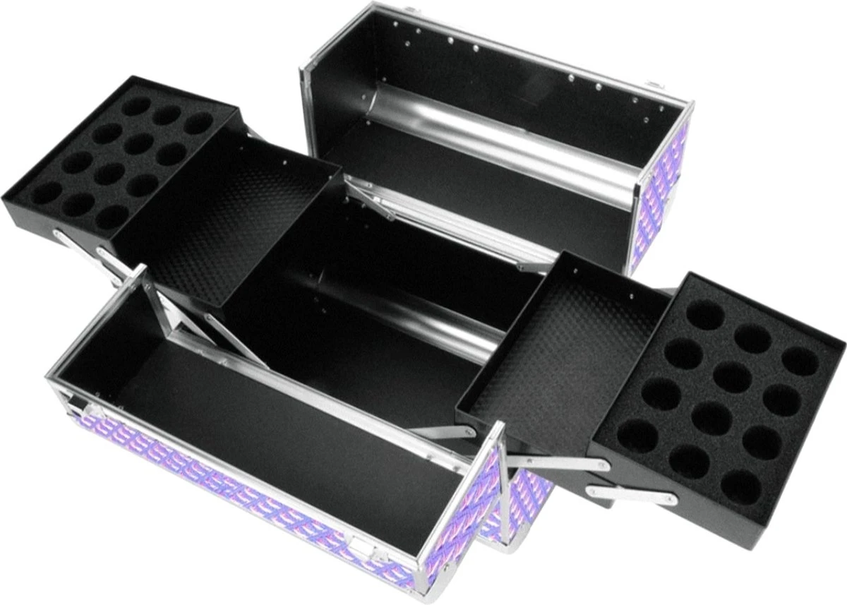 Deze koffer kan je tweezijdig openen en het heeft 4 uittrekbare planken voor kleine voorwerpen zoals hybride lak, penselen, kleine en grote cosmetica. Het onderste vak biedt plaats aan grotere voorwerpen zoals een LED-lamp en een freesmachine. Zeer stevig gebouwd met versterkte hoeken en balken aan de buitenranden om 100% veiligheid te garanderen.