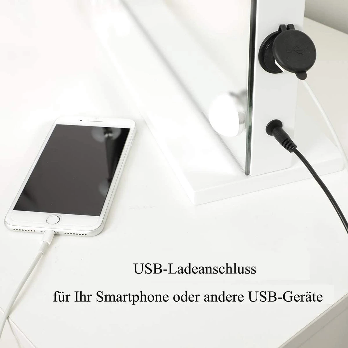 - USB-Ladeanschluss: Ein 5 V/2 A USB-Ladeanschluss an der Seite des Spiegelrahmens zum einfachen Aufladen Ihres Handys. Mit abnehmbarer 10-facher Vergrößerung.
